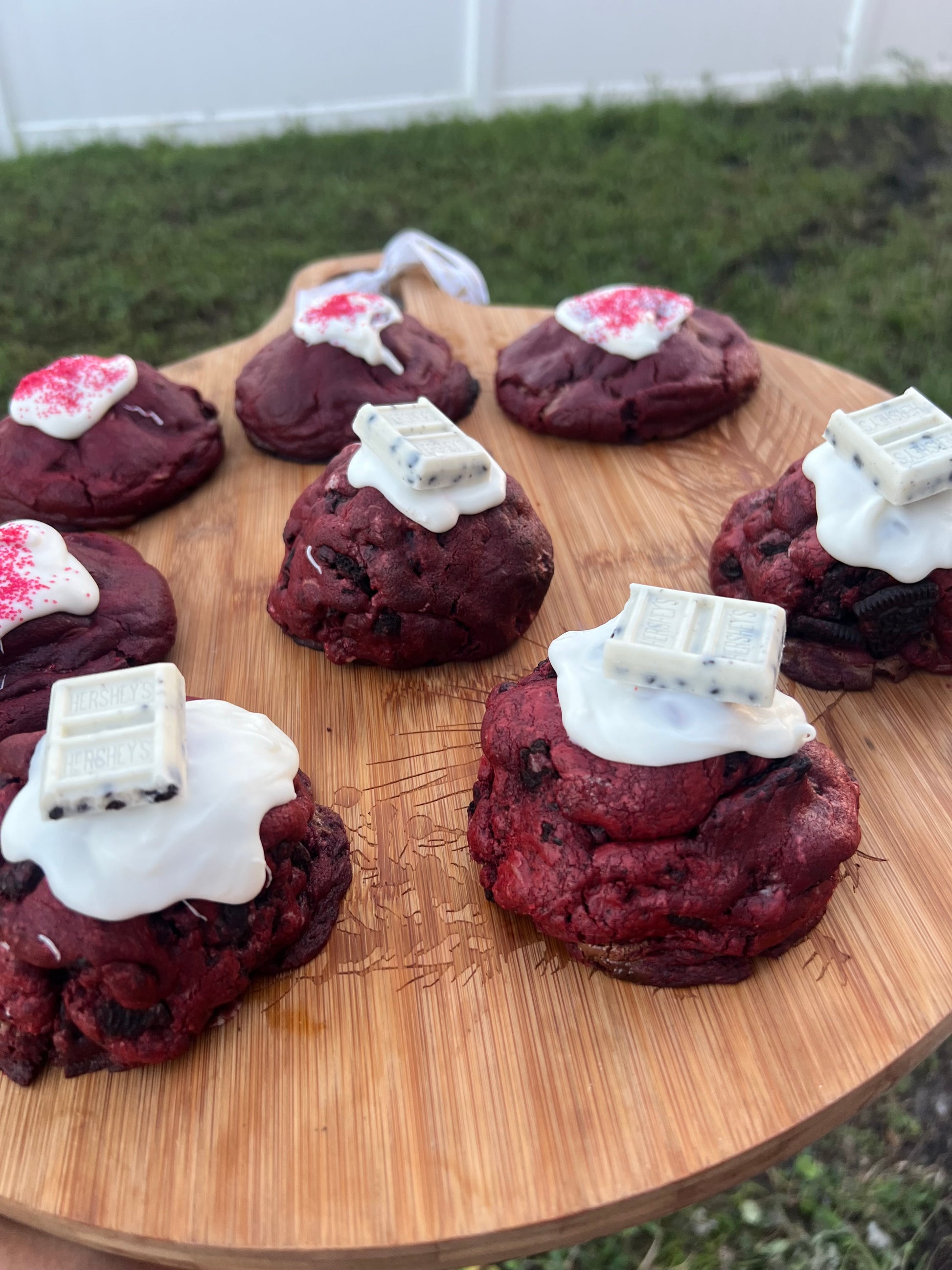 Experience the deliciousness of Red Velvet Oreo cookies - a delectable combination of cream cheese, milk chocolate, and Oreos. Each cookie weighs 6oz, making it a truly indulgent treat.