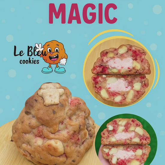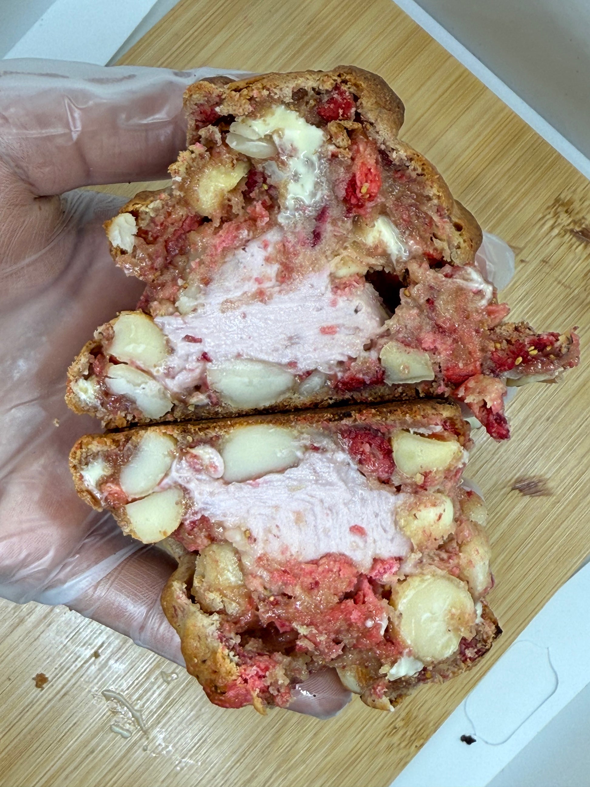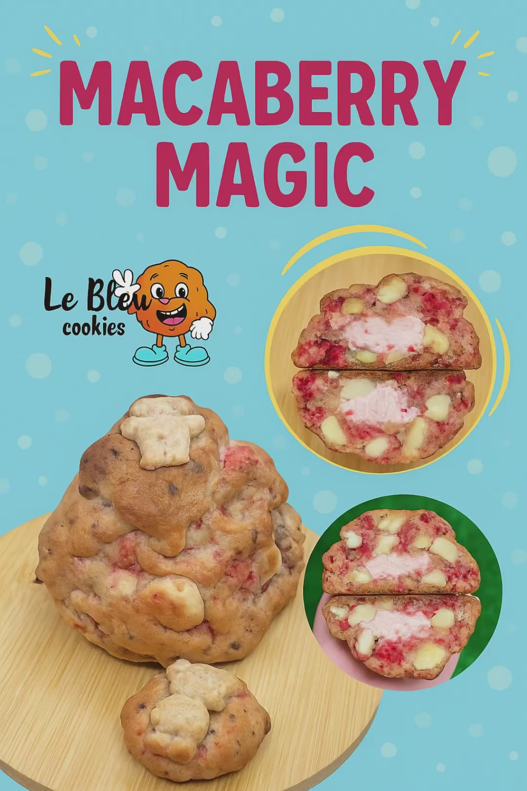 Say hello to the cookie that’s pure enchantment! Our Macaberry Magic is a soft, chunky delight packed with macadamia nuts, creamy white chocolate chips, real strawberries, and crunchy strawberry wafer cookies — but the real magic is inside: a luscious strawberry cream cheese filling that melts in your mouth.
